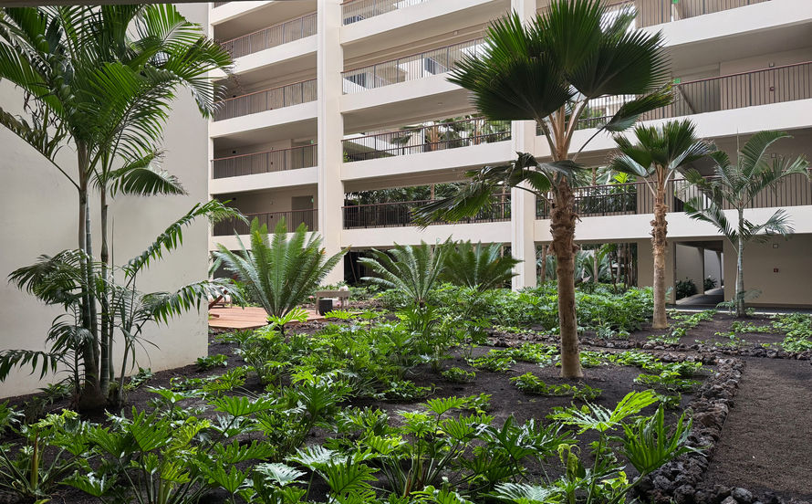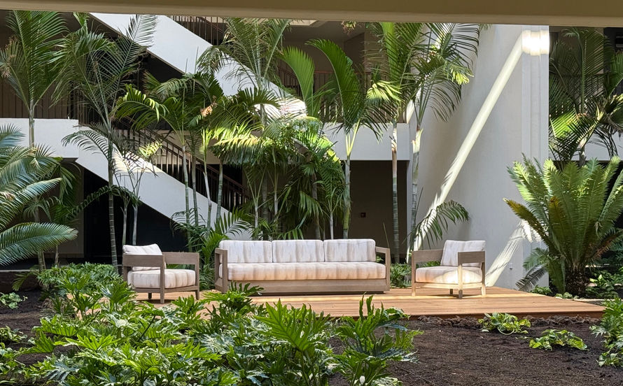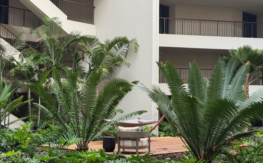 Māla Designs designed this unique and tranquil atrium where you can unwind and savor the solitude. This serene environment offers guests the perfect escape from the hustle and bustle, allowing for peaceful reflection and relaxation. Enjoy the calming ambiance as you immerse yourself in the beauty of your surroundings at Mauna Lani Resort. It's the ideal place to recharge and connect with your inner self.
